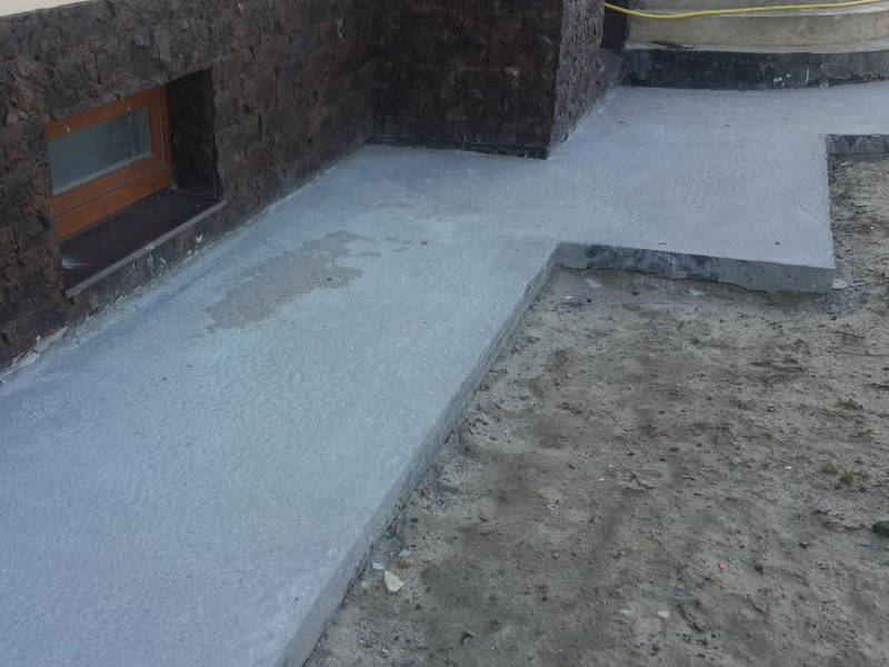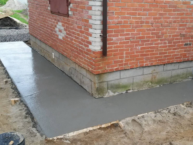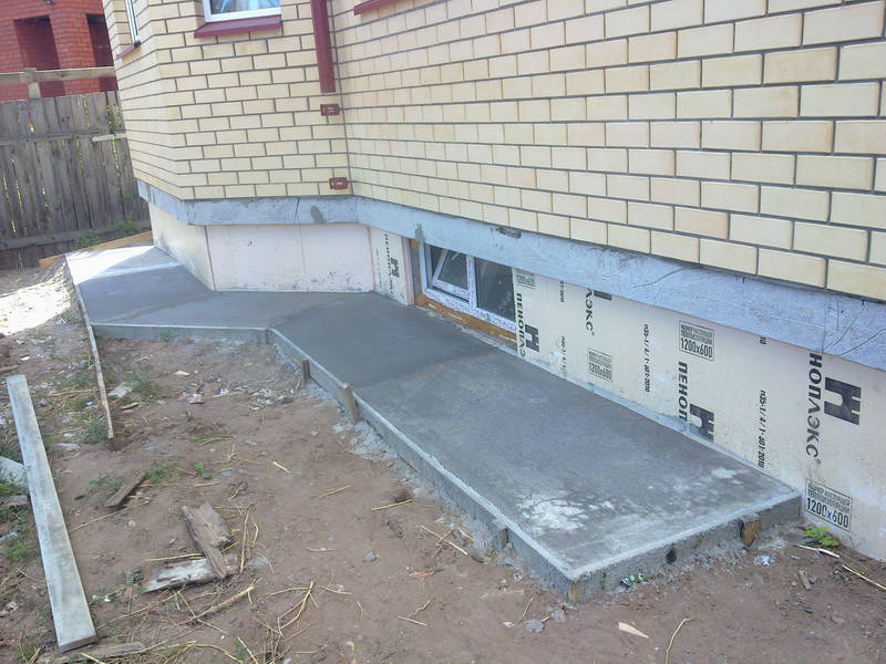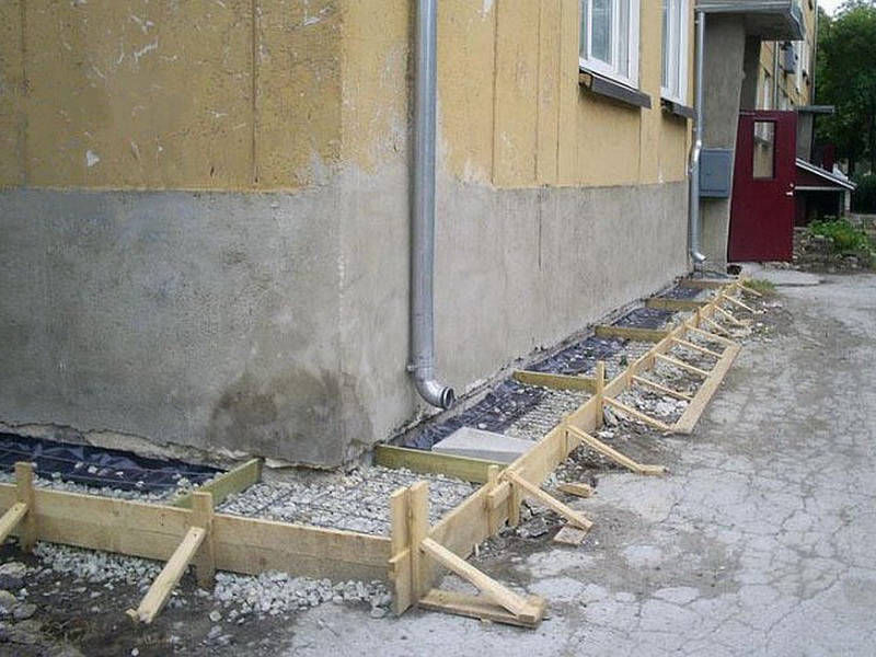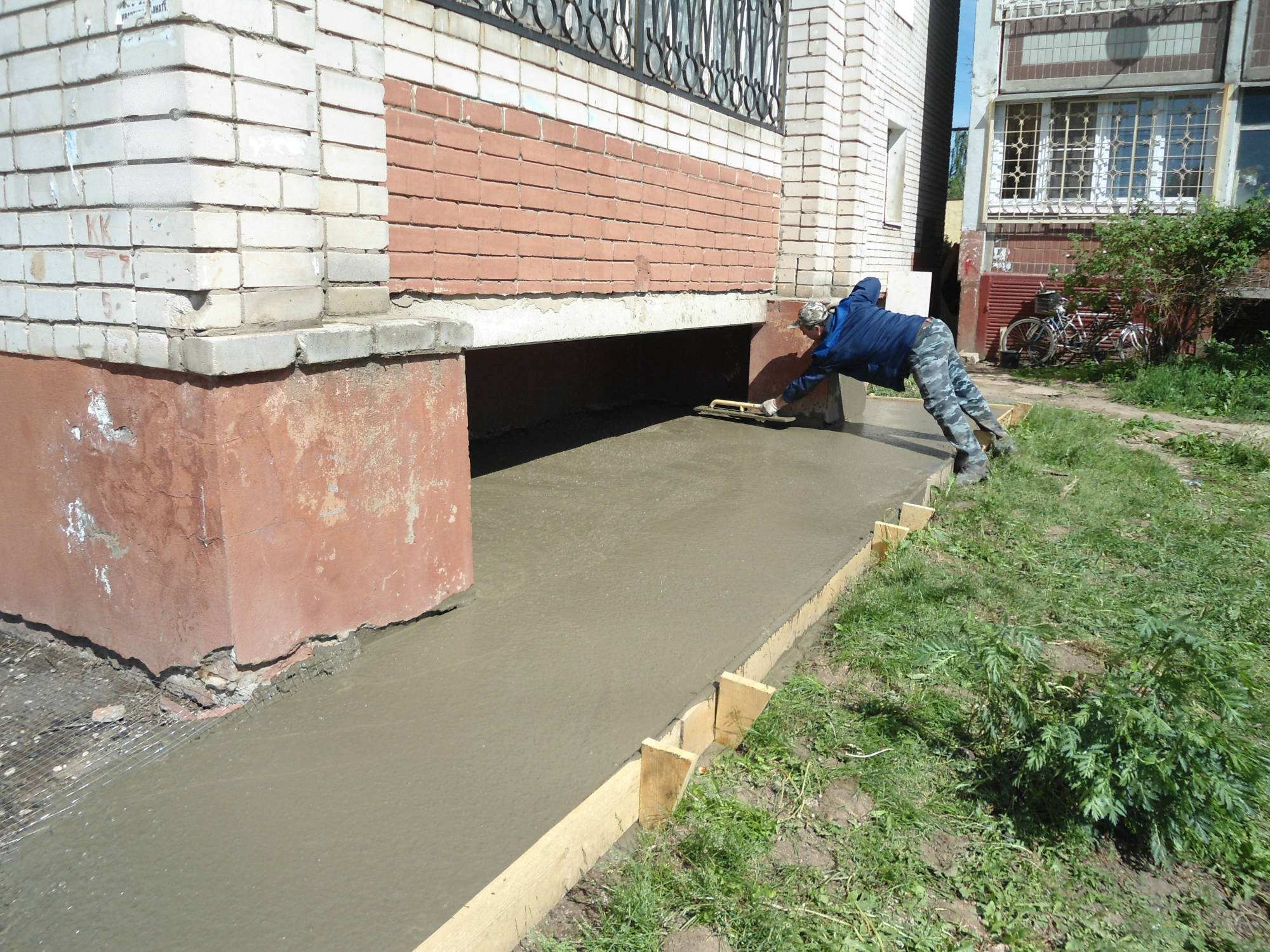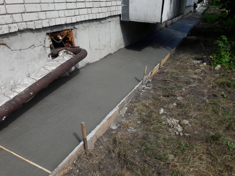 Завершают процесс устройства отмостки укладкой верхнего покрытия из бетона, дальнейшим его выравниванием с соблюдением технологических уклонов..