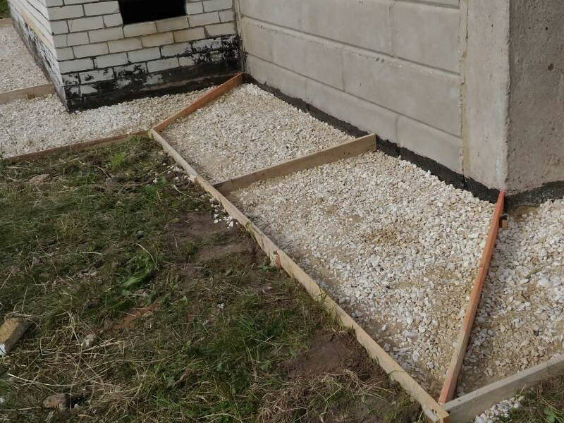 Одним из этапов устройства отмостки является монтаж опалубки, а так же засыпка и утрамбовка песка. В продолжении, на утрамбованное основание будущей отмостки, между стеной дома и краем опалубки, укладывается слой гравия или щебня, так же плотно утрамбовованный. Далее производится армирование и установка деформационных швов.